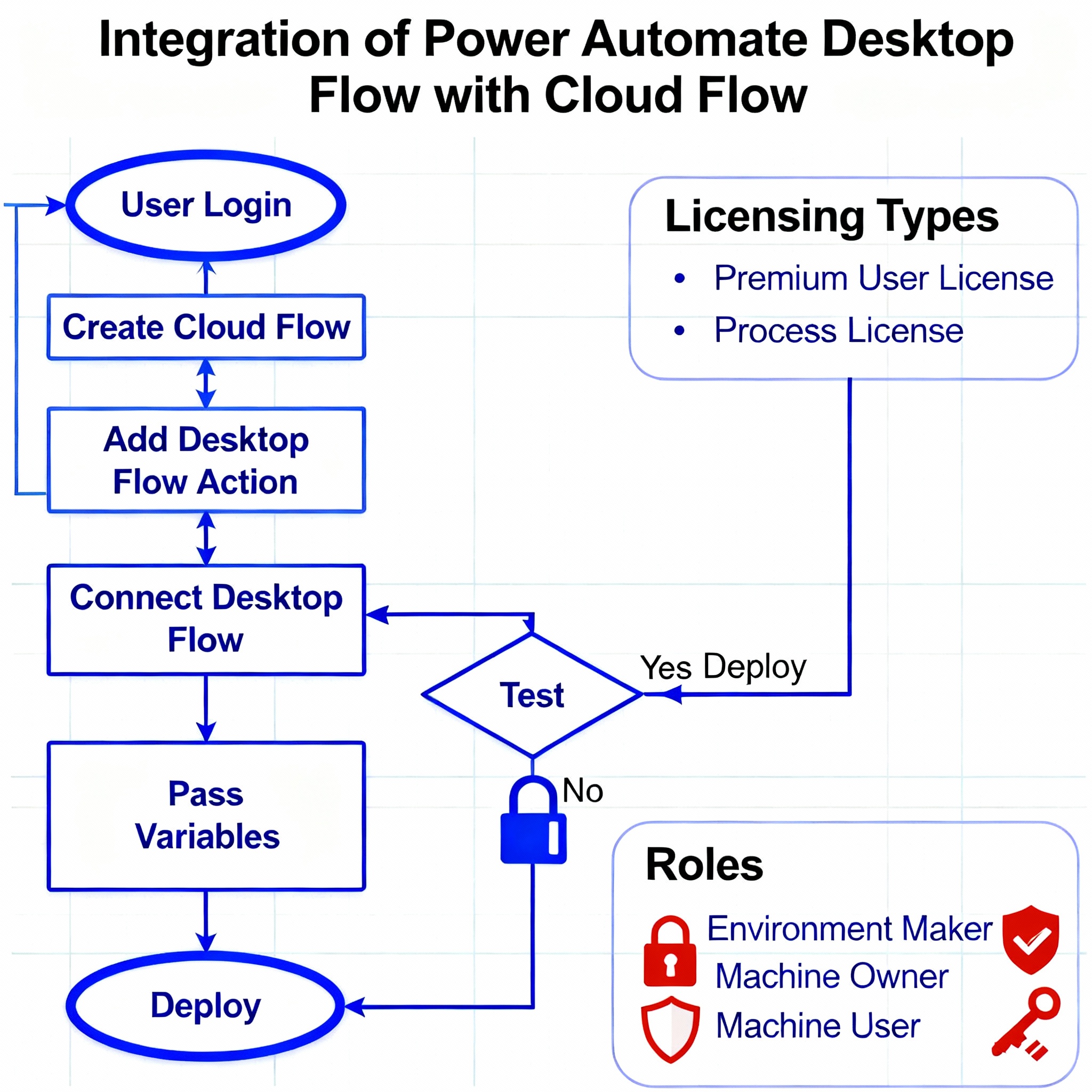 Die Verknüpfung von Power Automate Desktop Flow mit Cloud Flow erfolgt durch das Einfügen eines Desktop Flow-Schritts im Cloud Flow, verbunden über eine Desktop Flow-Verbindung, unterstützt durch Variablenübergabe. Dafür wird mindestens eine Power Automate Premium Lizenz benötigt, bei größeren, unbeaufsichtigten Szenarien kommen Process- oder Kapazitätslizenzen hinzu. Das Rechtekonzept beruht auf differenzierten Rollen für Erstellung, Verwaltung und Ausführung der Flows, das besonders in großen Organisationen Sicherheit und flexible Steuerung gewährleistet.